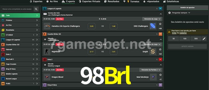 O 98Brl oferece uma grande seleção de opções de apostas em e-sports com probabilidades competitivas